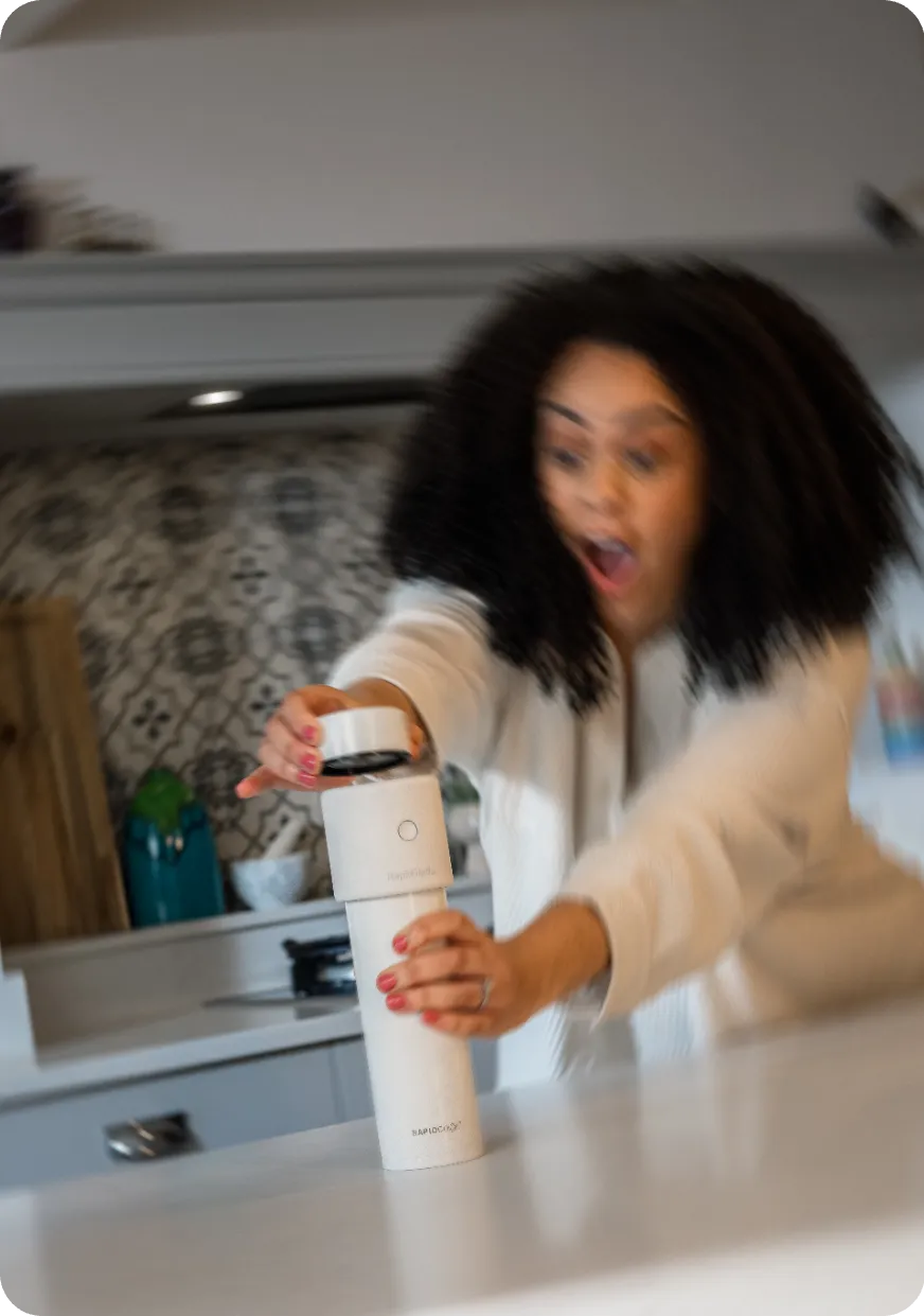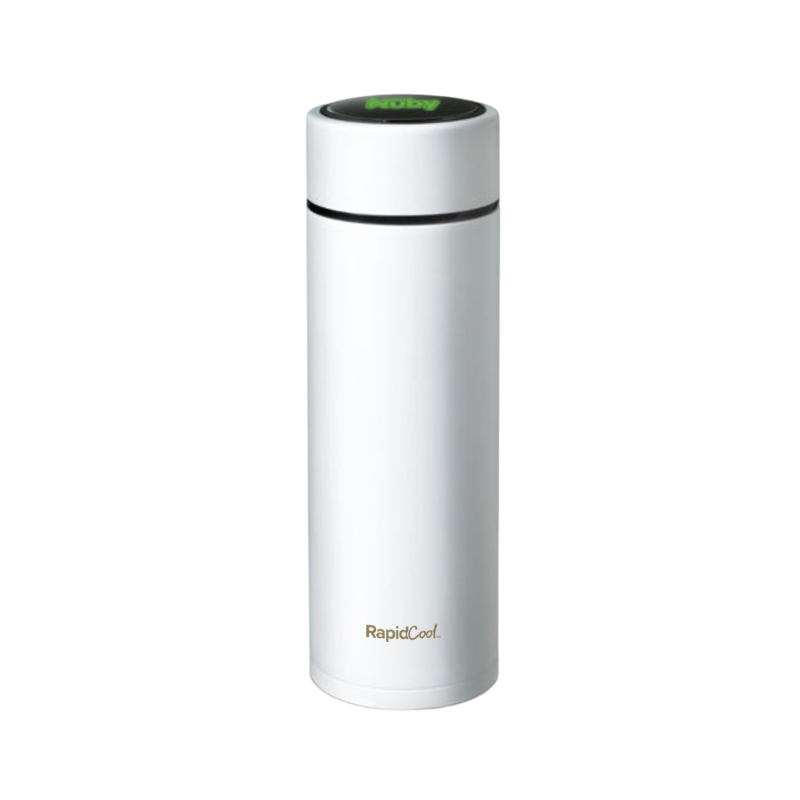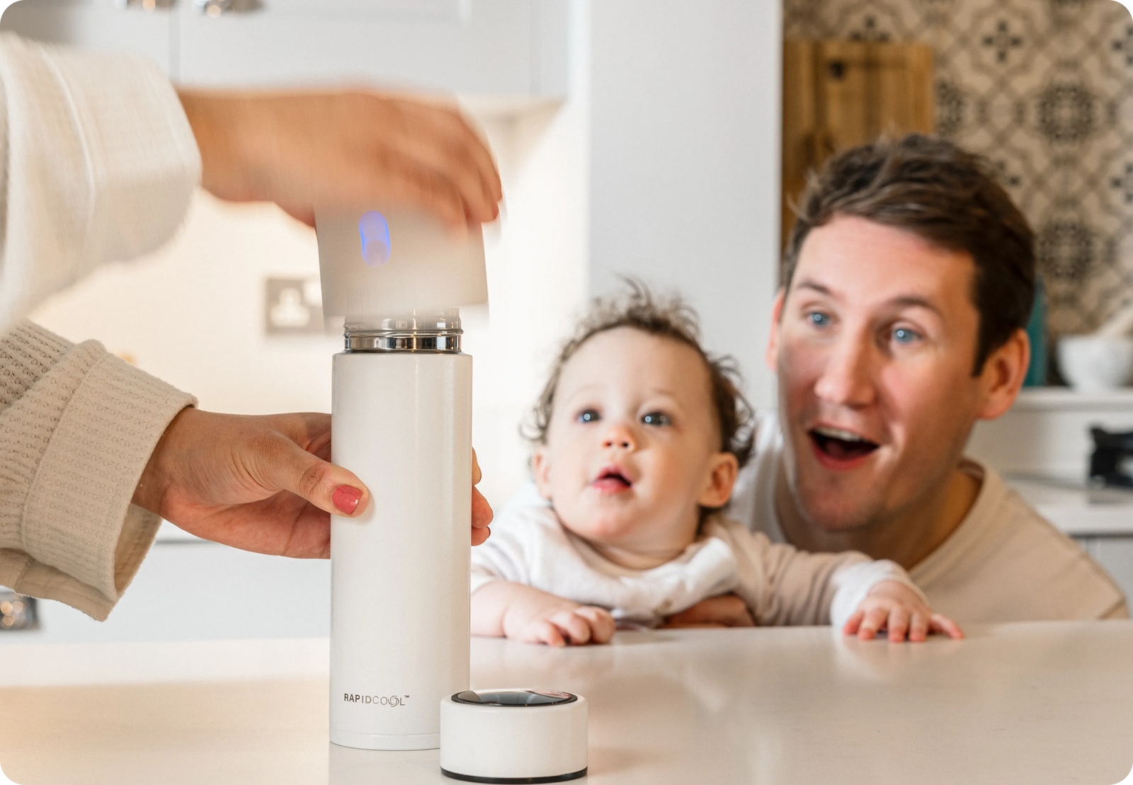First up in the RapidTeam, it’s the firm favourite, the OG of milk prep, the RapidCool. Now you’ll no doubt already be familiar with this nifty little number, 1 in 4 parents already own one for starters, but this little piece of wizardry is going to cool boiling water down to drinkable-by-baby temperature (to NHS Guidelines) in less than 2 minutes*. And you can use it anywhere, and we mean anywhere.
