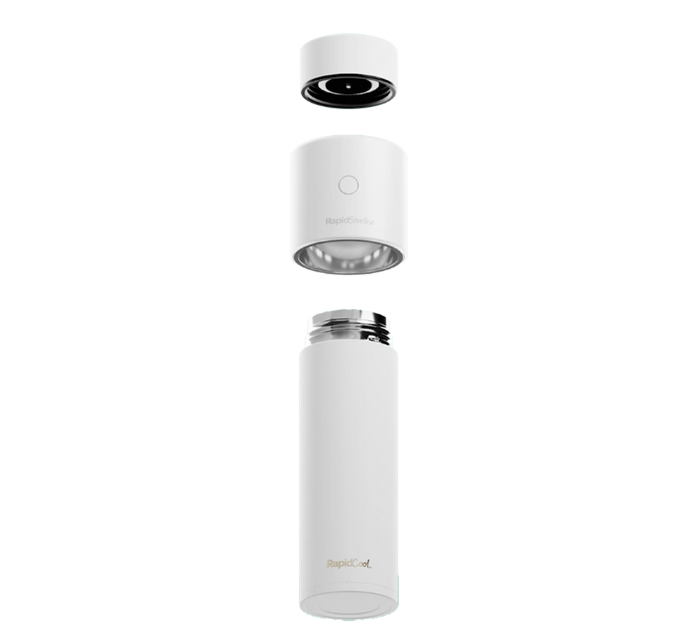 How are you going to keep your RapidCool sterilised after use though, we hear you ask? In fact, you literally did ask that, which is exactly why we set our product technicians about solving that little issue for you…an issue that is no more thanks to the second RapidTeam member, the RapidSterilise. Fitting neatly between the RapidCool and its lid to provide bidirectional sterilising, this harnesses the antibacterial power of UV to sterilise your RapidCool from top to bottom in just 1 minute. No more messing around with cold water sterilisation and fizzy tablets, just pop it on, press the button and let it work its magic.
